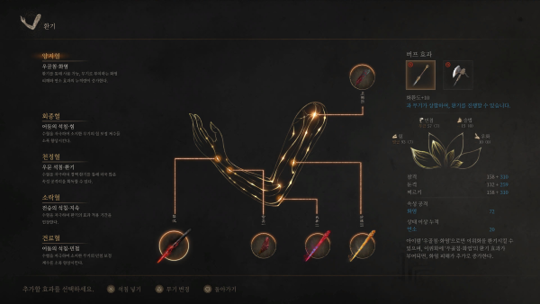 각 무기마다 고유의 무기 스킬이 있고, 같은 무기 군에 공통적으로 적용 가능한 유파 스킬이 있습니다.